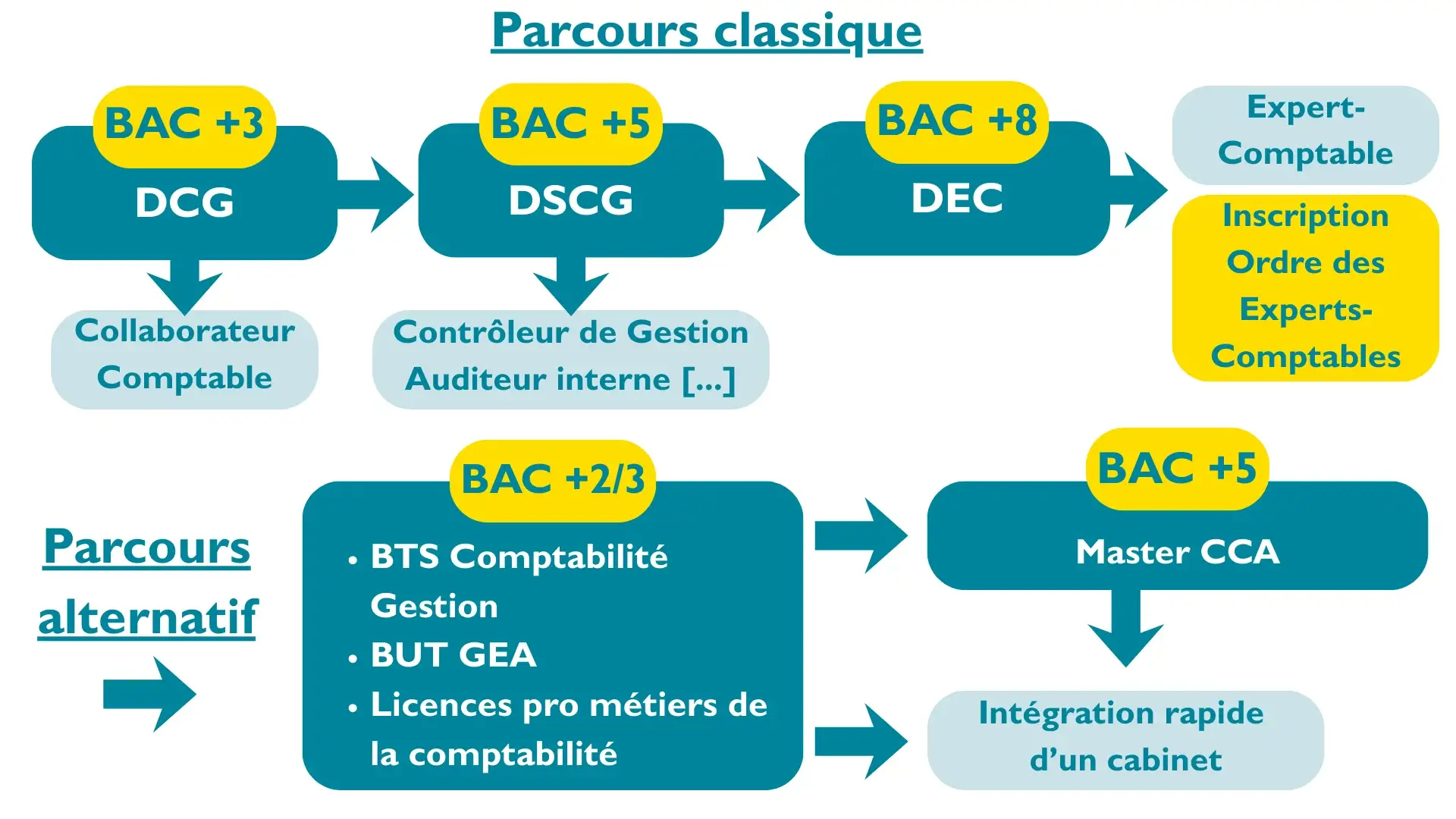 Le schéma ci-dessous reprend les différents parcours pour atteindre les métiers de la comptabilité :